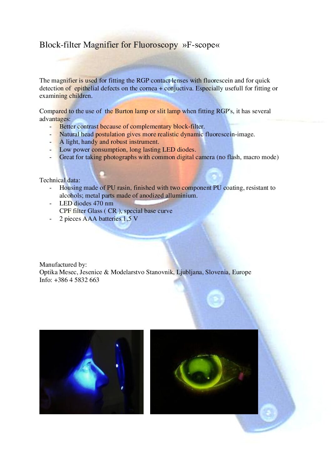 Inspection lamp F-Scope is patented, robust CPF-filter magnifier for inspection of RGP lenses on the eye.